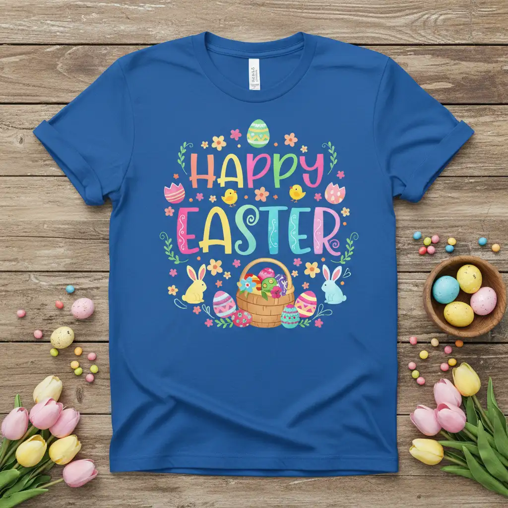 The intricate details of the Happy Easter design are sure to captivate. Adorable bunnies peek out from behind a basket brimming with colorful Easter eggs, while little chicks add an extra touch of sweetness. Delicate flowers and leafy vines frame the entire composition, bringing the freshness of spring right to your shirt. This thoughtful arrangement makes the design stand out and radiate positivity.