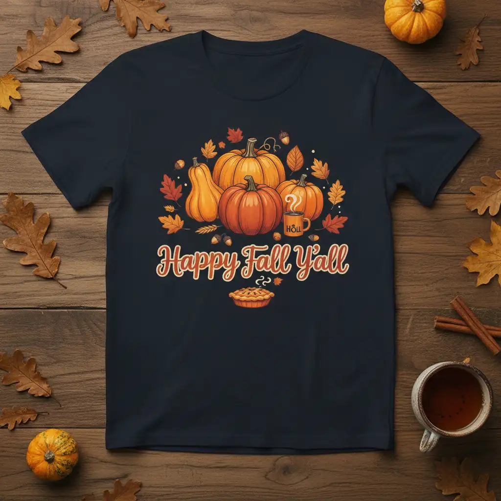 Happy Fall Y’all is more than just a phrase; it’s an invitation to embrace the crisp air, vibrant colors, and cozy atmosphere of the autumn season. This t-shirt captures that spirit perfectly, featuring a delightful design that celebrates everything we love about fall. From the rich hues of pumpkins and gourds to the scattering of fallen leaves and acorns, every element evokes the warmth and charm of harvest time. It’s the ideal way to express your love for this beautiful time of year and share that festive feeling with everyone you meet.