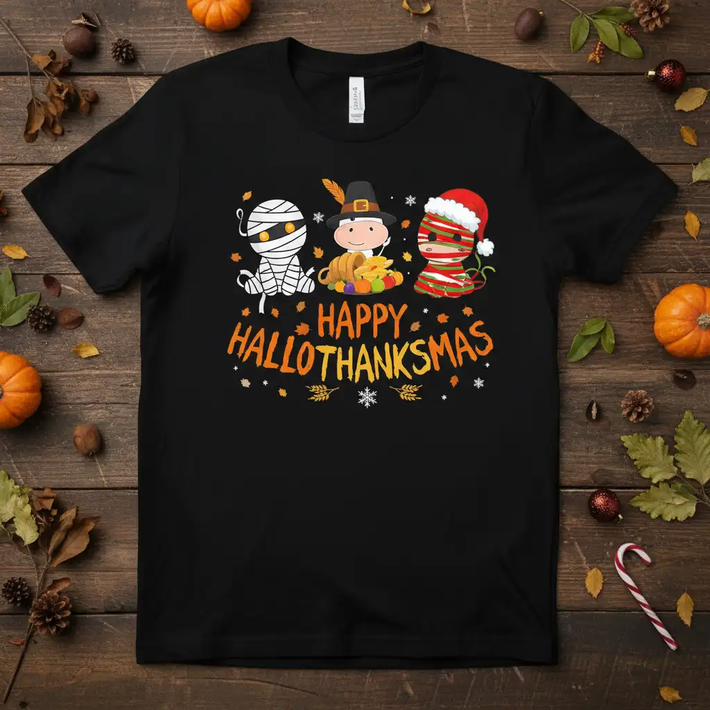 The vibrant text “HAPPY HALLOTHANKSMAS” pops against the dark fabric, ensuring the message is clear and celebratory. It’s an ideal conversation starter at parties, family gatherings, or casual outings during the extended holiday season. This design appeals to a wide audience, from kids who love dressing up to adults who appreciate clever holiday mashups and unique apparel.