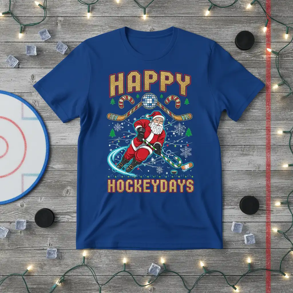This vibrant t-shirt showcases a playful interpretation of holiday cheer, featuring Santa Claus as a hockey player. The design incorporates sparkling gold lettering for “HAPPY HOCKEYDAYS,” creating an eye-catching visual that captures the festive spirit. It’s an ideal choice for anyone looking to combine their love for winter sports with seasonal celebrations.