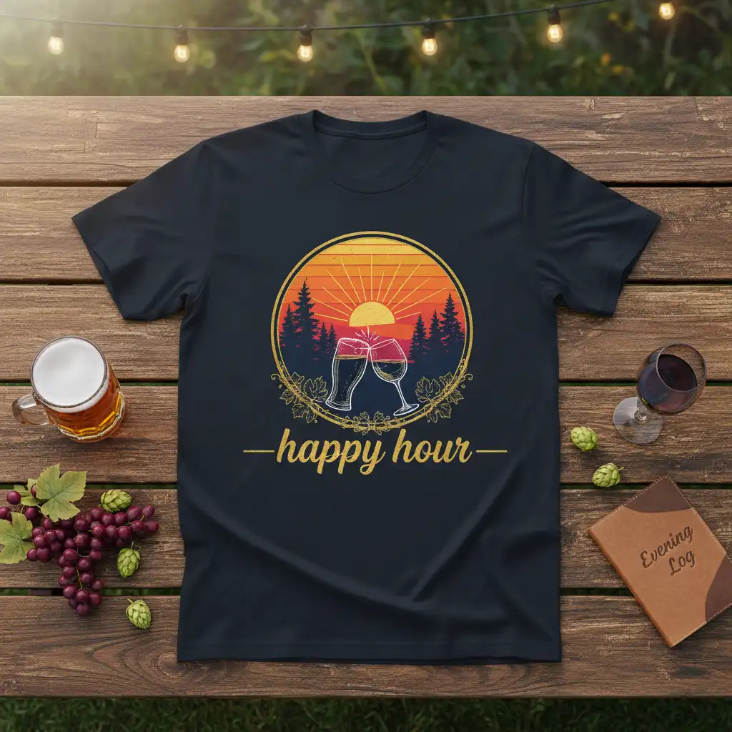 Don’t miss out on the opportunity to own this beautifully designed “happy hour” t-shirt. It’s a wearable reminder to embrace life’s simple pleasures and make time for joy. Perfect for gifting or adding a touch of personality to your own collection, this tee is sure to become a favorite. Order yours today and get ready to raise a glass to good times!