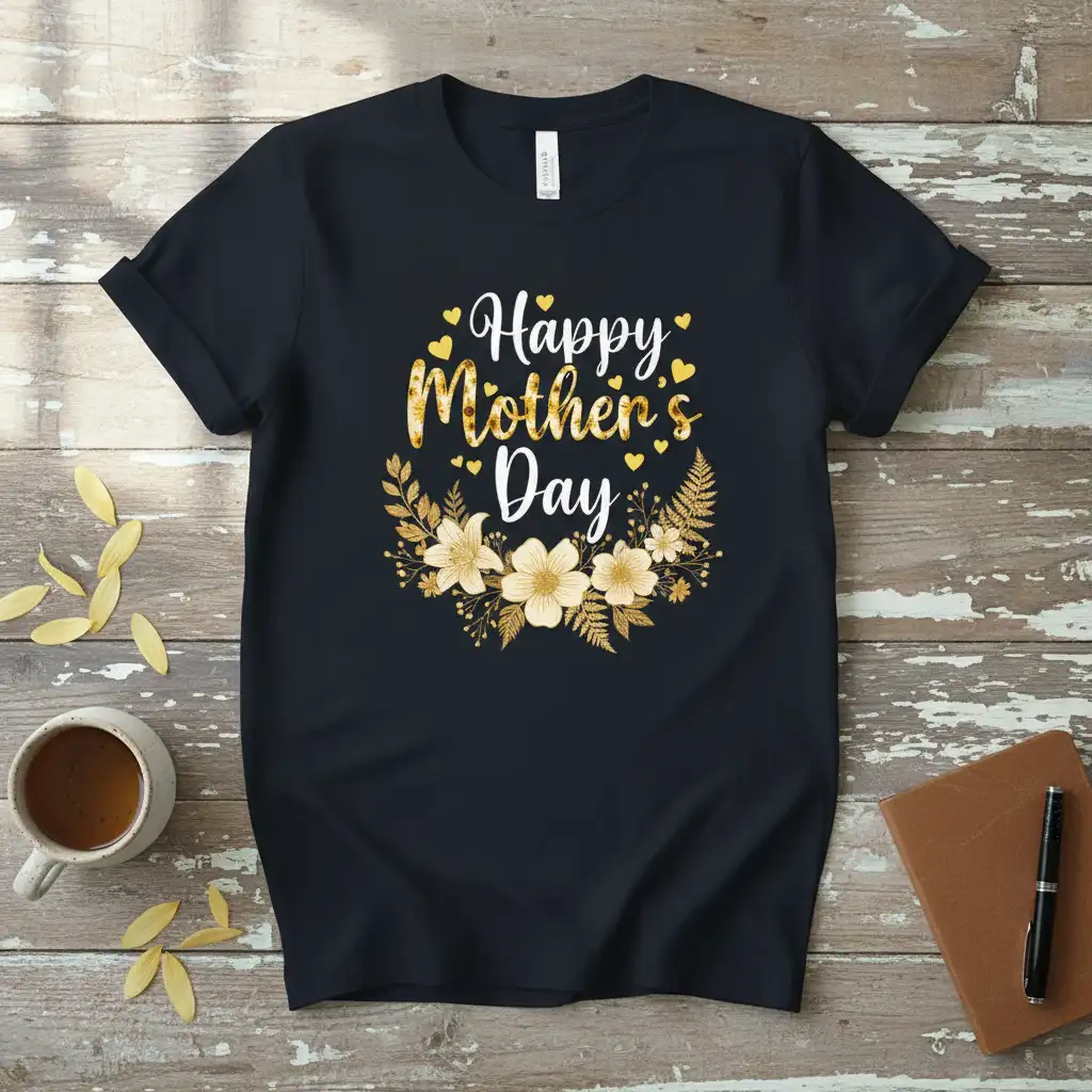 The attention to detail in this design ensures it will be a cherished item. From the shimmering golden elements to the delicate floral patterns, every aspect is crafted to evoke warmth and happiness. It’s a simple yet powerful way to say “Happy Mother’s Day” and honor the incredible women in our lives. This shirt is sure to bring a smile to her face.