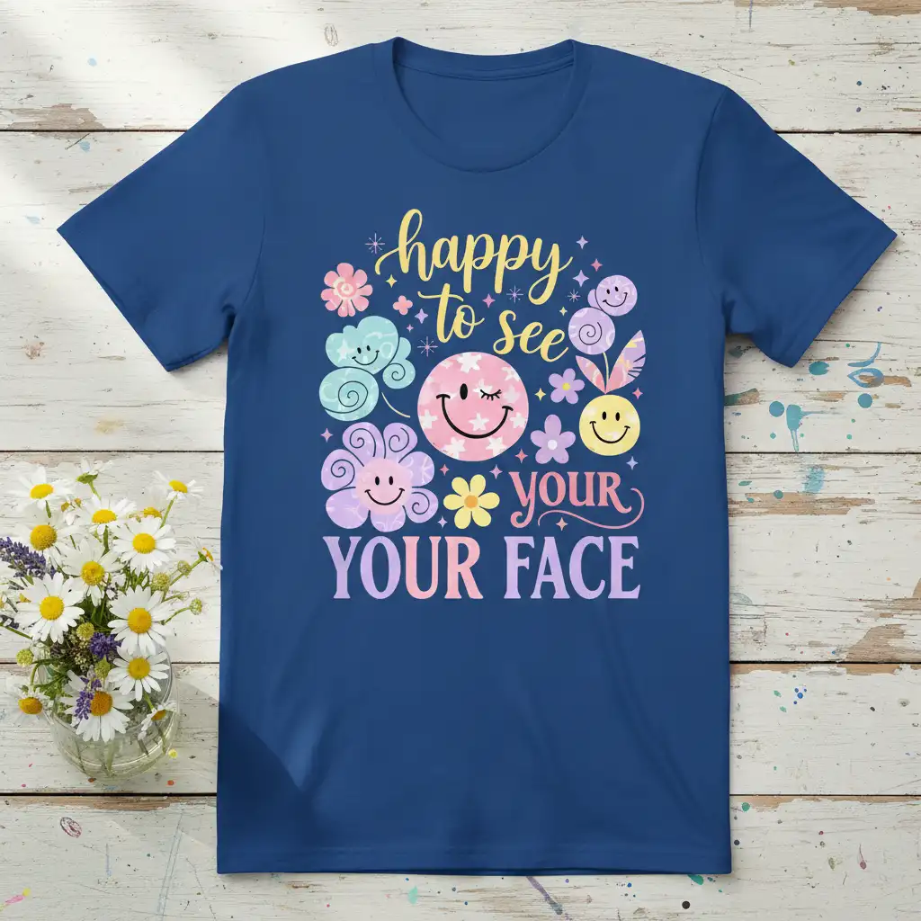 To complement the vibrant design, this shirt comes in several classic colors. Select from Black, Red, Navy, White, Dark Heather, or Royal to best match your personal style and preference. Each color option provides a beautiful backdrop for the joyful “Happy to See Your Face” graphic, allowing you to pick the shade that makes you feel most radiant and ready to share your smile.