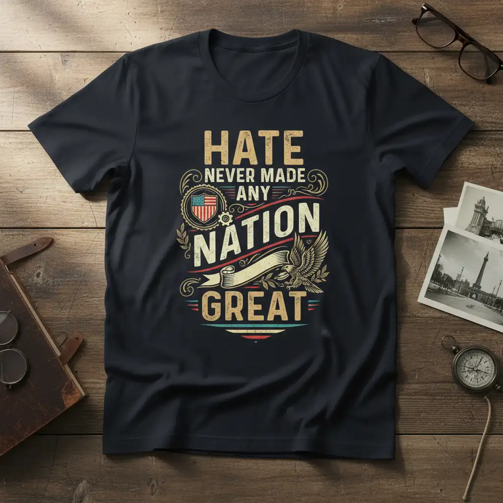 This t-shirt is more than just clothing; it’s a symbol of hope, unity, and a commitment to building a stronger nation together. The “Hate Never Made Any Nation Great” message is a profound statement that encourages reflection and positive action. By choosing this tee, you’re not only making a fashion statement but also aligning yourself with values of peace, understanding, and collective progress. Embrace this powerful sentiment and wear it as a beacon of your beliefs, inspiring conversations and fostering a sense of community wherever you go. Order yours today and wear your message with pride!