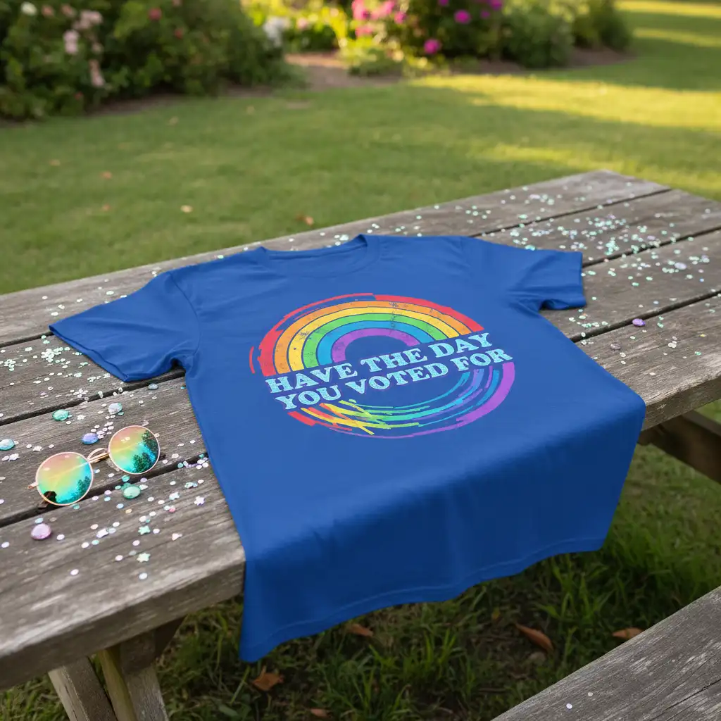 This “Have The Day You Voted For” t-shirt is an ideal choice for anyone looking to celebrate Pride Month, advocate for equality, or simply spread a message of positivity. It’s a versatile piece that pairs well with jeans, shorts, or skirts, making it suitable for various occasions. The design is inclusive and speaks to anyone who believes in the power of voting and the importance of creating a world where everyone is celebrated.