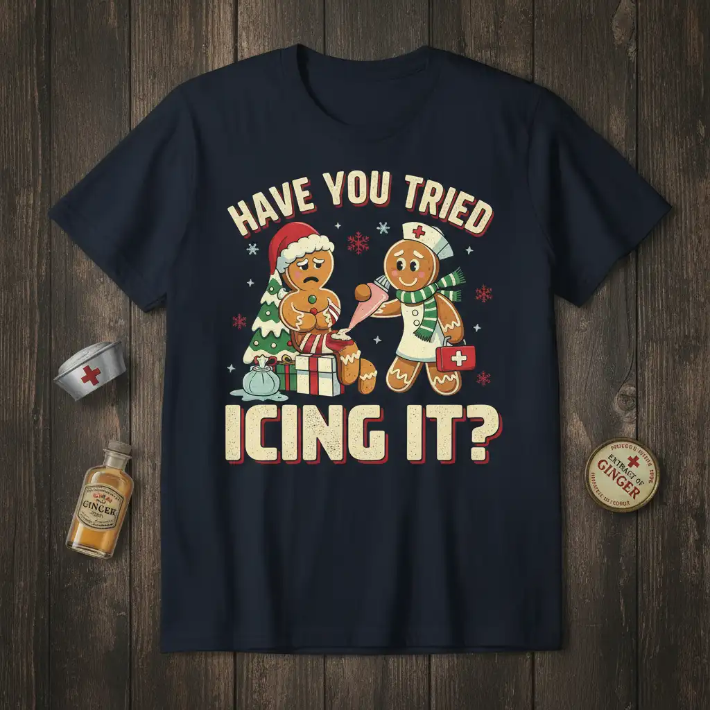 The witty text “HAVE YOU TRIED ICING IT?” adds an extra layer of humor, making this shirt a standout piece for your holiday wardrobe. It’s ideal for Christmas parties, casual wear during the festive period, or as a thoughtful gift for friends and family.