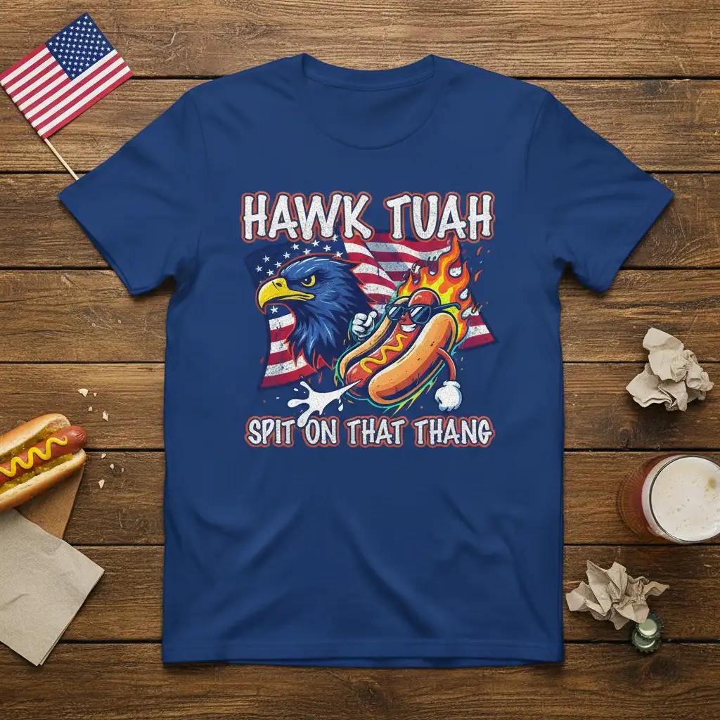 This HAWK TUAH SPIT ON THAT THANG design isn’t just funny; it’s also a nod to American spirit with its prominent use of the Stars and Stripes. The combination of the majestic eagle, the fiery hot dog, and the iconic phrase creates a patriotic yet playfully irreverent vibe. It’s the perfect way to express your love for country and your appreciation for the lighter side of online culture. This shirt is ideal for Fourth of July celebrations, Memorial Day barbecues, or any day you want to inject some fun into your outfit.