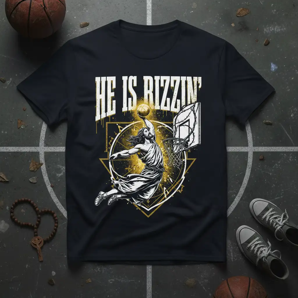 This eye-catching design features a stylized depiction of Jesus Christ soaring through the air for a powerful slam dunk. The bold typography “HE IS RIZZIN'” stands out prominently, adding a touch of playful wit to the divine imagery. The artwork is rendered with striking detail, using a combination of white and gold accents against a classic black t-shirt, creating a visually dynamic and memorable look.