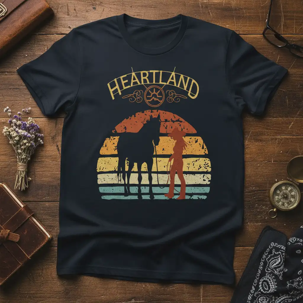 Capture the essence of the open range with this stunning Heartland T-Shirt. Featuring a captivating vintage sunset scene with a horse and rider, it’s perfect for anyone who loves western style and country vibes. This comfortable tee makes a fantastic gift for horse lovers and ranch life enthusiasts.