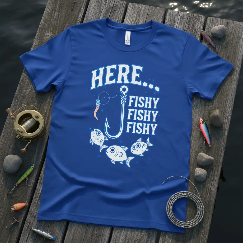 Pick from Black, Navy, Royal, Dark Heather, Red, and White to match your mood and wardrobe staples. Each colorway keeps the HERE… FISHY FISHY FISHY FISHY design clear and photo-ready for everyday wear.