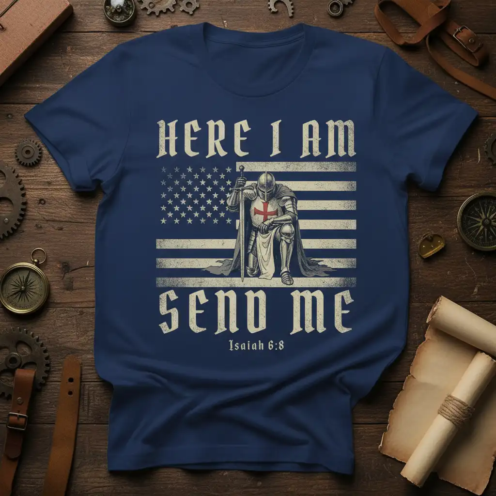 HERE I AM SEND ME Isaiah 6:8, this powerful Christian t-shirt is designed for those who feel called to serve and express their unwavering faith. The striking graphic combines a knight in full armor, symbolizing strength and readiness, with a stylized American flag, representing conviction and homeland. This design is more than just apparel; it’s a statement of purpose and a declaration of devotion to a higher calling. It serves as a constant reminder of biblical passages that inspire courage and commitment in everyday life, making it a meaningful addition to any wardrobe. Wear your faith proudly and let this shirt be a conversation starter about your spiritual journey and beliefs.