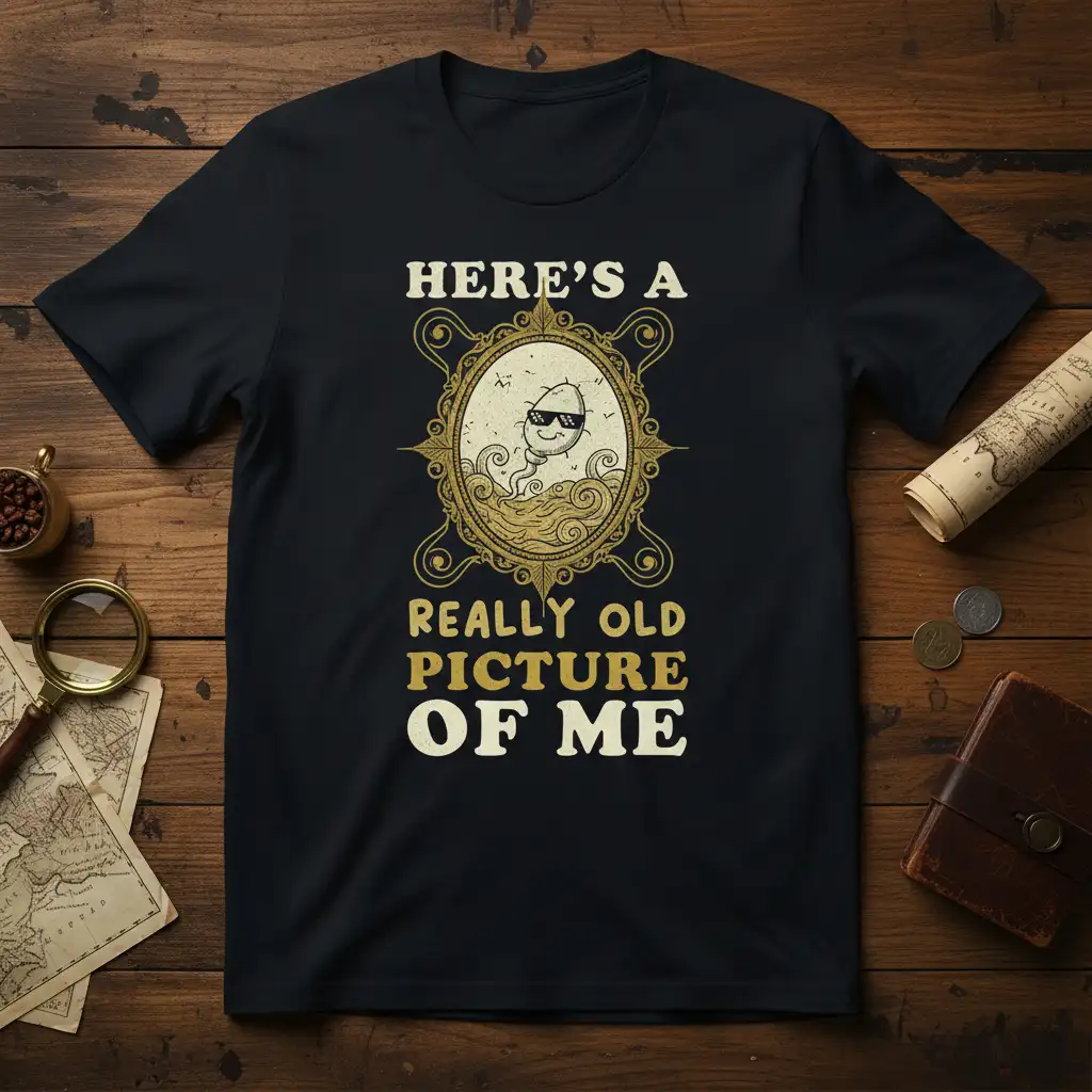 HERE’S A REALLY OLD PICTURE OF ME, and this t-shirt lets you wear that sentiment with pride and a whole lot of humor. This design is perfect for anyone who enjoys a good laugh, especially when it involves a bit of self-deprecating wit and a nod to the past. It’s a fantastic way to express your personality and share a chuckle with friends and family. The graphic is eye-catching and the quote is instantly relatable for those who appreciate vintage humor.