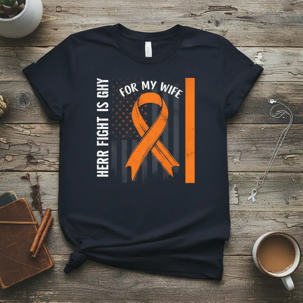 The fusion of the orange ribbon and the American flag creates a compelling visual narrative. It speaks to the deep personal battles fought every day, often with the spirit of national pride and collective strength. This design is perfect for husbands who want to publicly express their dedication and stand with their wives through every challenge they may face.