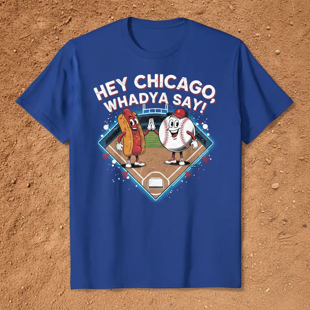 The “Hey Chicago, Whadya Say!” t-shirt is designed for those who bleed Chicago blue and love to represent their city. The bold text is paired with a charming illustration of a hot dog and a baseball character high-fiving on a baseball diamond, evoking a sense of fun and camaraderie. This design is a perfect way to express your connection to Chicago’s unique identity and its rich cultural tapestry.
