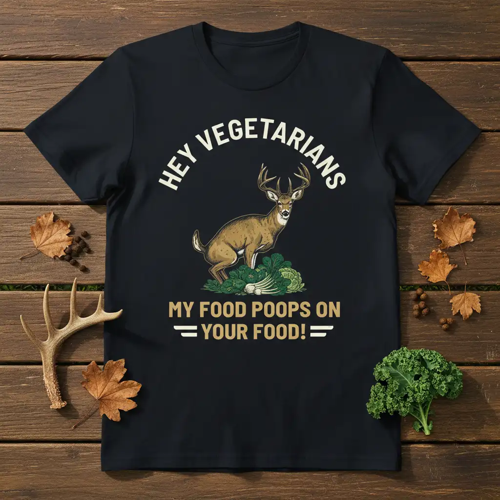 HEY VEGETARIANS MY FOOD POOPS ON YOUR FOOD! This unique and humorous t-shirt is designed to spark laughter and conversation. It’s the perfect way to express a bold, witty sense of humor, especially for those who appreciate hunting, the outdoors, or simply a good, cheeky joke. The design combines a striking visual with a memorable quote, making it an instant favorite for anyone who loves to stand out. It’s more than just apparel; it’s a statement piece that embodies a playful spirit and a love for the unconventional.