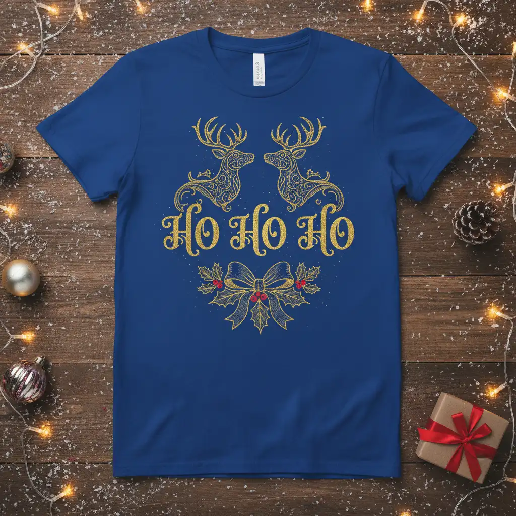The “Ho Ho Ho” t-shirt is more than just a piece of clothing; it’s a statement of holiday spirit. The combination of the classic Christmas greeting, majestic reindeer, and festive bow creates a harmonious design that appeals to all ages. It’s the perfect way to express your love for the season and add a touch of sparkle to your wardrobe. This design is meticulously crafted to ensure it looks fantastic, making you the center of holiday attention.
