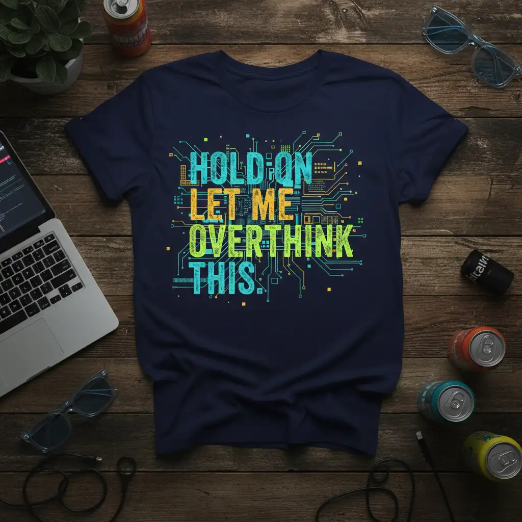 This HOLD ON LET ME OVERTHINK THIS. design is not just about the quote; it’s about celebrating a certain way of thinking. The graphic elements are designed to appeal to those with an eye for detail and an appreciation for modern, tech-inspired art. It’s a conversation starter that’s both witty and stylish, making it a cherished item for anyone who wears it.