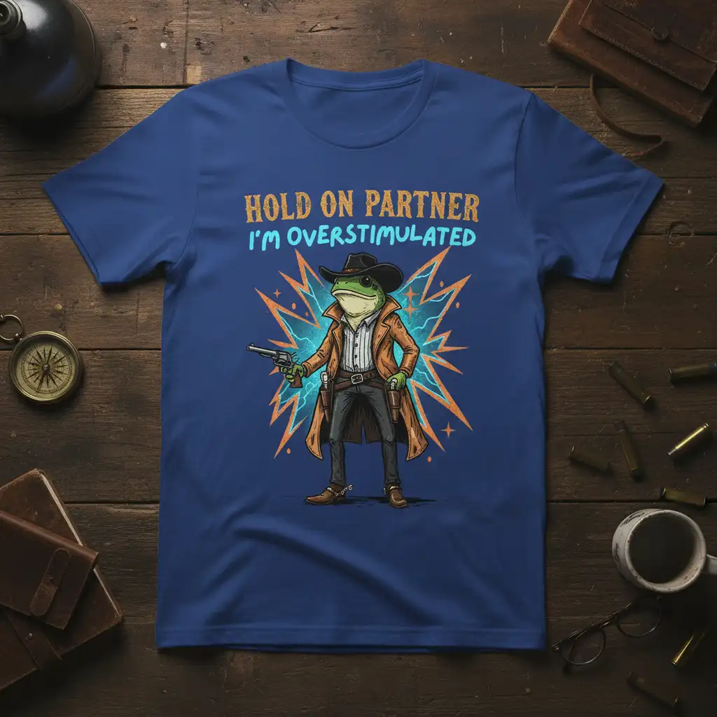 Hold On Partner I’m Overstimulated, this phrase perfectly encapsulates a feeling many can relate to, now brilliantly depicted on a unique graphic tee. This design features a dapper frog dressed as a cowboy, complete with a hat, duster coat, and a pistol at the ready, embodying a moment of witty exasperation. It’s more than just a shirt; it’s a conversation starter and a bold statement for those who appreciate humor and a touch of the wild west. Wear it to express your mood or gift it to someone who understands the sentiment behind the phrase.