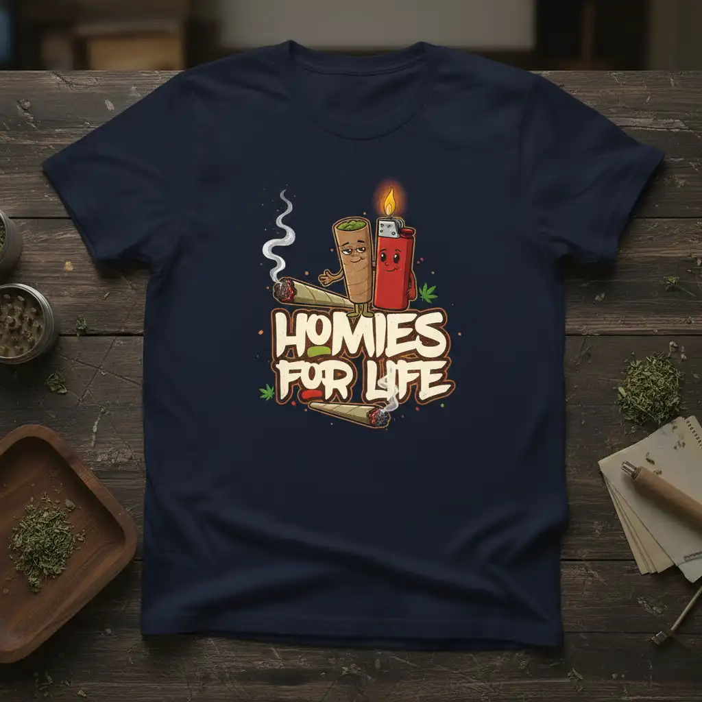 This eye-catching t-shirt showcases the endearing phrase “HOMIES FOR LIFE” in bold, stylized lettering. The accompanying graphic art features a friendly joint character standing side-by-side with a cheerful lighter character, complete with subtle smoke wisps and decorative cannabis leaves. This design perfectly encapsulates the spirit of enduring friendship and shared moments, making it an ideal gift for your best friends or anyone who appreciates the cannabis culture.
