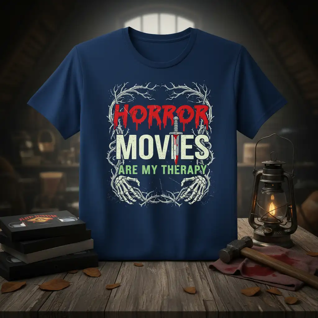 Don’t just watch horror movies; wear your love for them with pride. This t-shirt is a testament to the unique comfort and thrilling escape that horror cinema offers. It’s the perfect way to showcase your identity as a dedicated fan and to connect with a community that understands the special appeal of a good scare. Grab this exceptional tee today and let the world know that for you, horror movies truly are the best therapy!