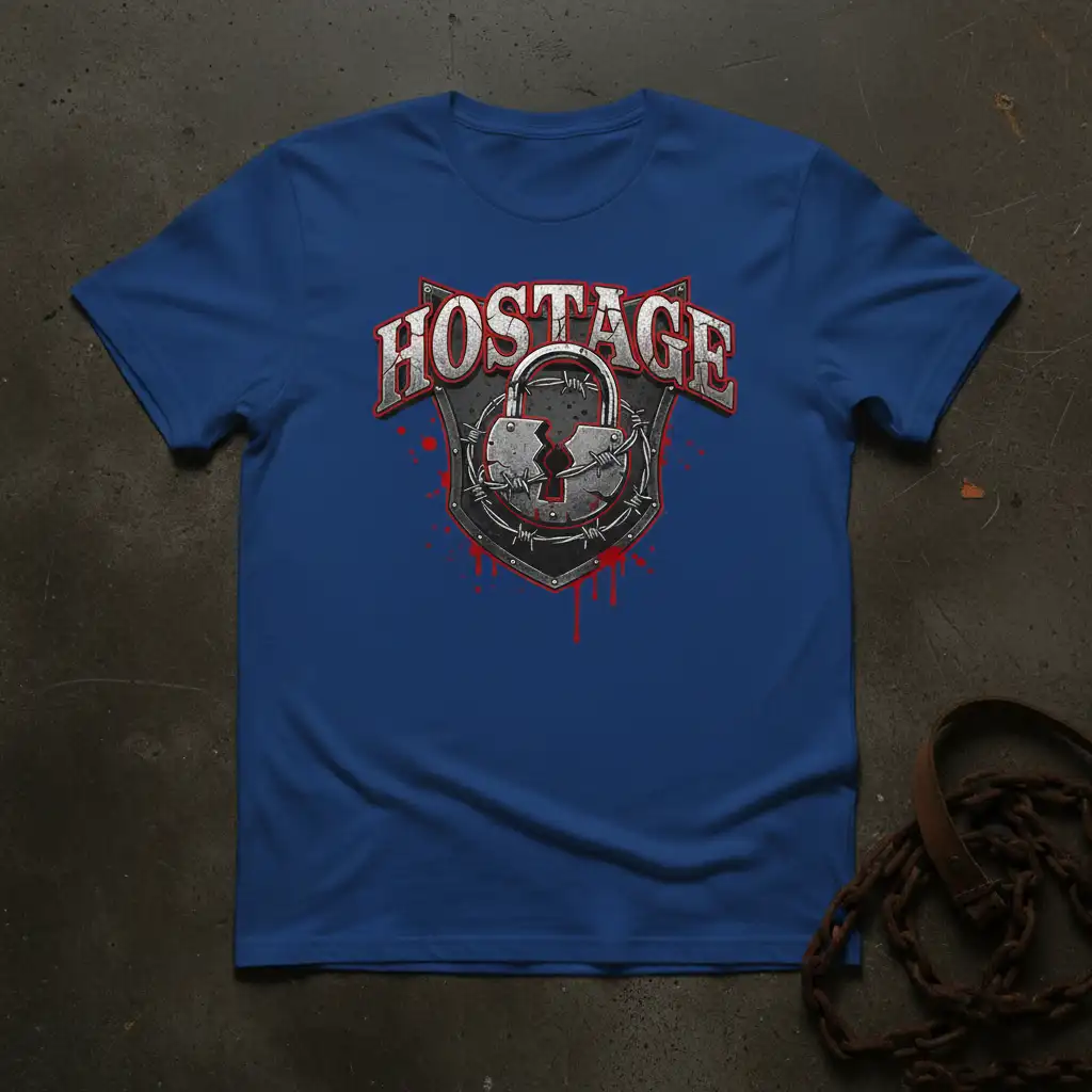 This graphic tee features the word “HOSTAGE” prominently displayed in a distressed, gothic-inspired font. Below it, a shield-shaped emblem showcases a broken padlock, symbolizing the act of escaping confinement or overcoming obstacles. The padlock is intricately wrapped with barbed wire, adding a layer of intensity and edginess to the overall design. Red splatters around the emblem further enhance the rebellious and defiant tone of the artwork.