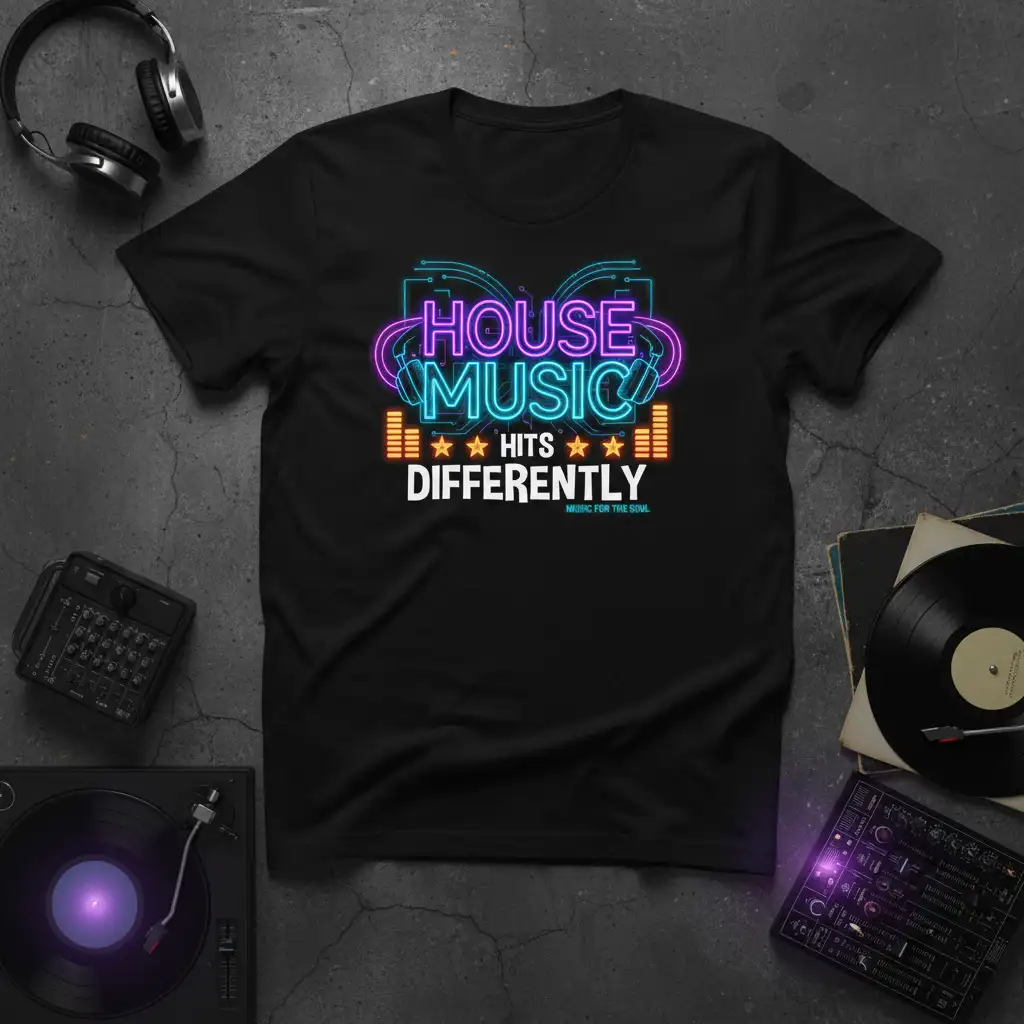 The core message of this design, “HOUSE MUSIC HITS DIFFERENTLY,” is a sentiment shared by countless electronic music enthusiasts worldwide. It speaks to the profound emotional connection and unique experience that house music offers, setting it apart from other genres. This t-shirt is a perfect way to showcase that distinct appreciation and connect with fellow fans. The stylish neon-inspired graphics, complete with subtle nods to DJ equipment, enhance the visual appeal and reinforce the theme.