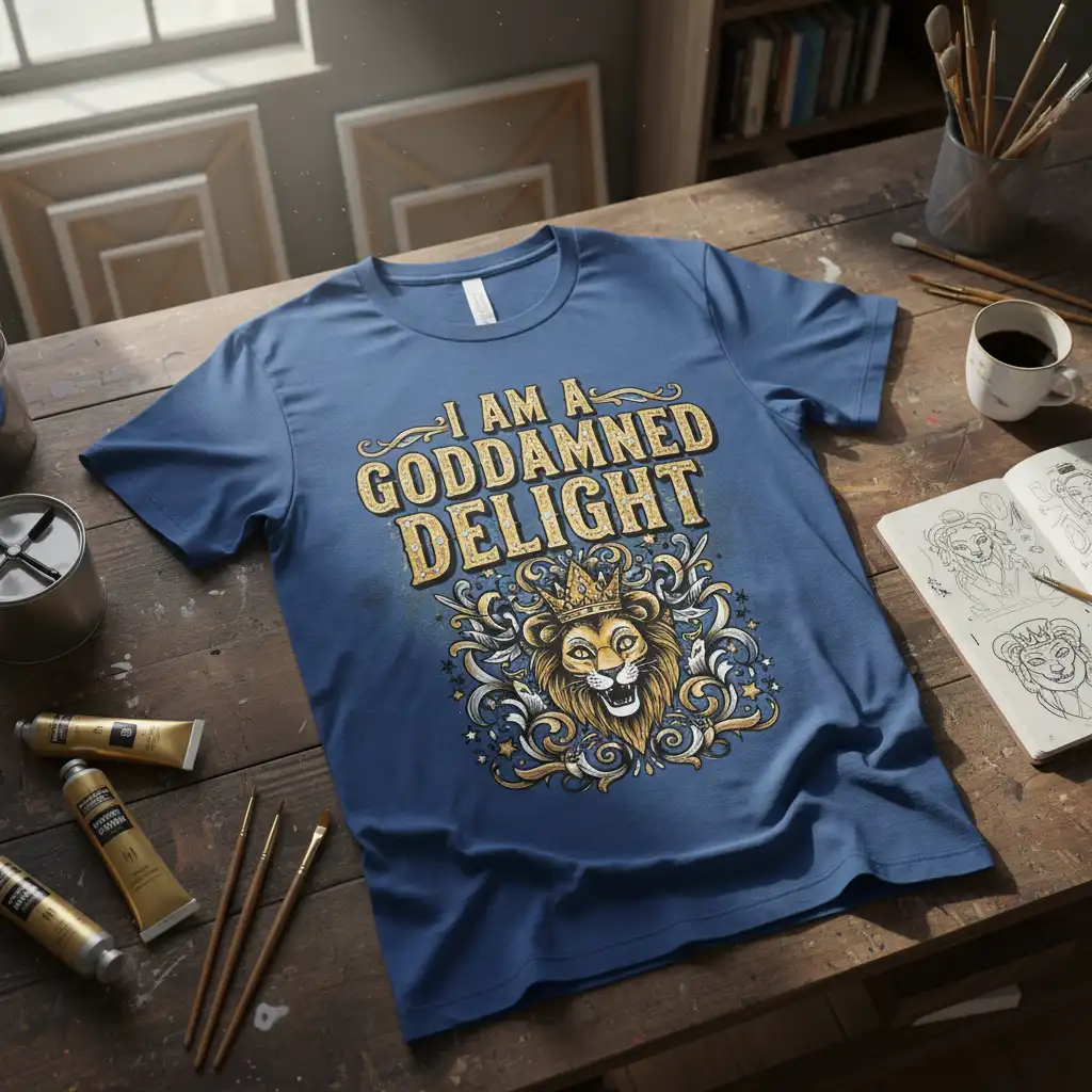 I AM A GODDAMNED DELIGHT this statement t-shirt is designed for individuals who exude confidence and possess an undeniable charm. Featuring a striking graphic of a crowned lion, this tee embodies strength, royalty, and a touch of playful arrogance. It’s more than just apparel; it’s a declaration of self-worth and a bold way to showcase your unique personality. The intricate details of the design, from the regal mane to the ornate flourishes, ensure that this shirt is a true work of art.