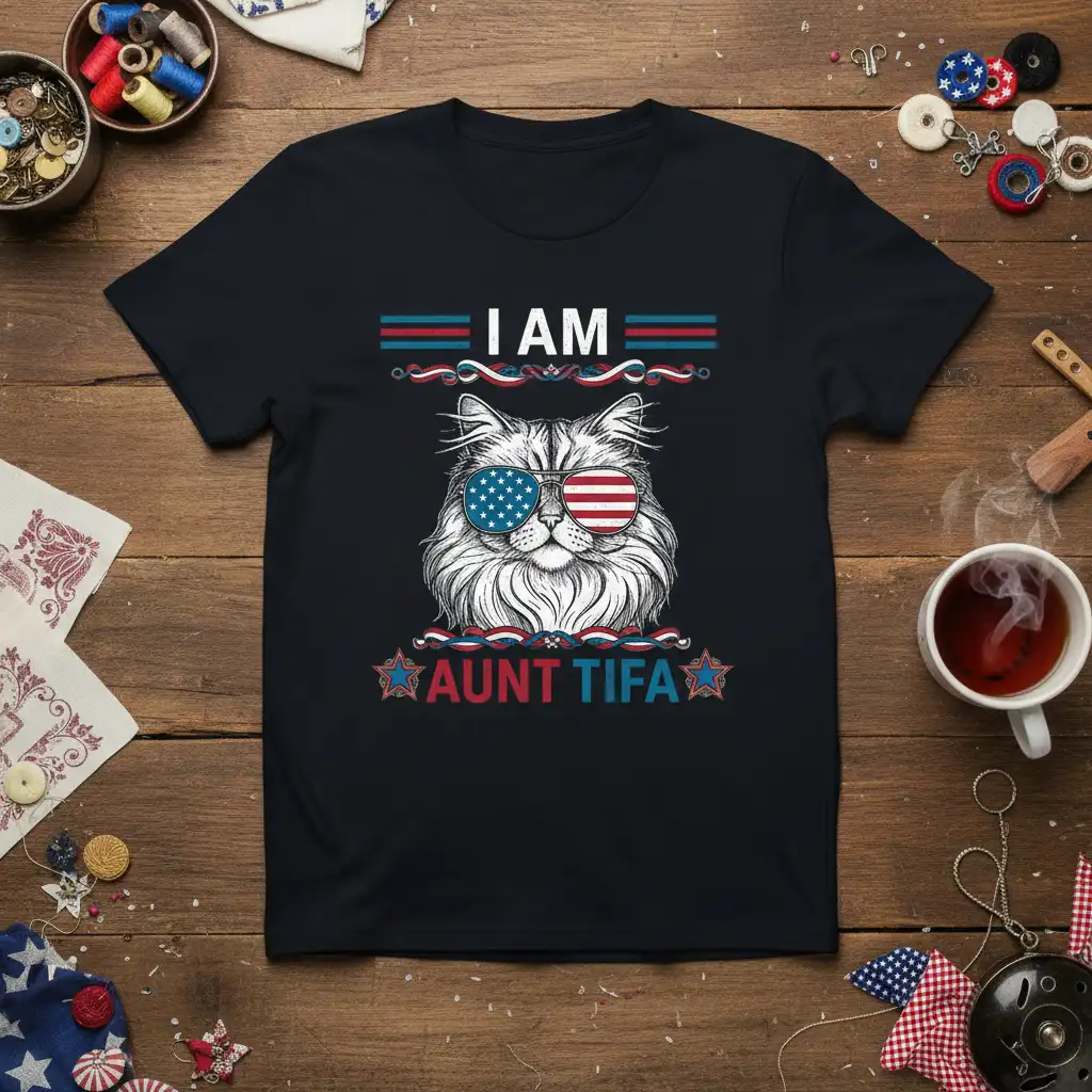 This striking tee features the declaration “I AM AUNT TIFA” in clear, eye-catching lettering, set against a backdrop of festive patriotic elements. The central graphic showcases a fluffy cat, exuding cool confidence behind sunglasses designed with the iconic stars and stripes of the American flag. It’s a design that perfectly captures the spirit of a proud aunt who loves her country and her cats.