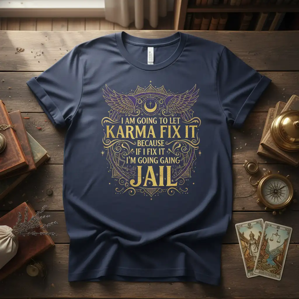 This design boldly proclaims, “I AM GOING TO LET KARMA FIX IT BECAUSE IF I FIX IT I’M GOING GAING JAIL.” It’s a humorous take on cause and effect, suggesting that sometimes, it’s best to let fate intervene rather than risk a more dire outcome. The phrase itself is a conversation starter, inviting smiles and shared understanding among those who get the joke.