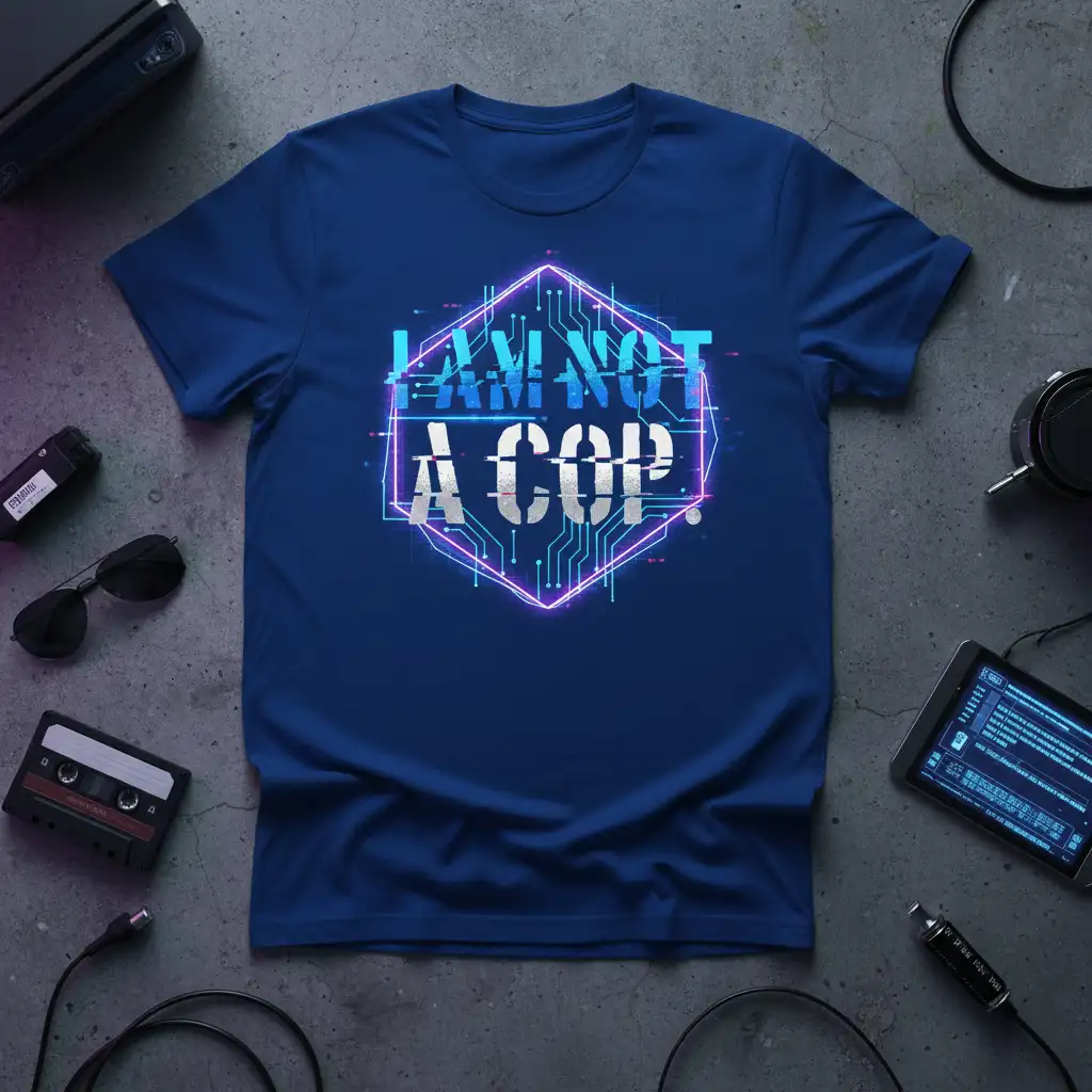 The statement “I am not a cop” is delivered with a modern, rebellious edge, making it a standout piece. It’s designed to be noticed and to spark curiosity, inviting dialogue about personal freedom and identity in an increasingly digital world. Wear it to express your independent spirit and your affinity for all things tech.