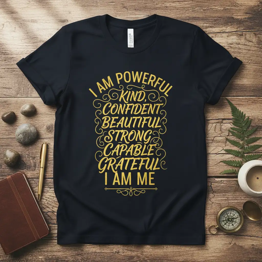 This remarkable tee features the complete affirmation “I AM POWERFUL KIND, CONFIDENT BEAUTIFUL STRONG CAPABLE GRATEFUL I AM ME” in a stunning gold, decorative font. It serves as a powerful daily reminder of your inherent worth and positive attributes. The design is meticulously crafted to be both visually appealing and deeply meaningful.