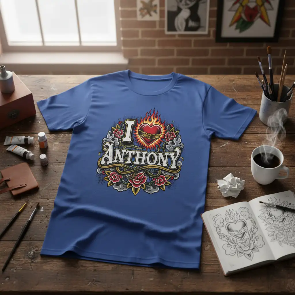 This captivating ‘I Anthony’ t-shirt design draws inspiration from timeless tattoo art, featuring a fiery heart emblem at its core. The vibrant flames symbolize passion and warmth, beautifully complementing the deep red roses that intertwine with the bold lettering. This aesthetic creates a powerful visual that resonates with those who appreciate artistic expression and meaningful declarations.