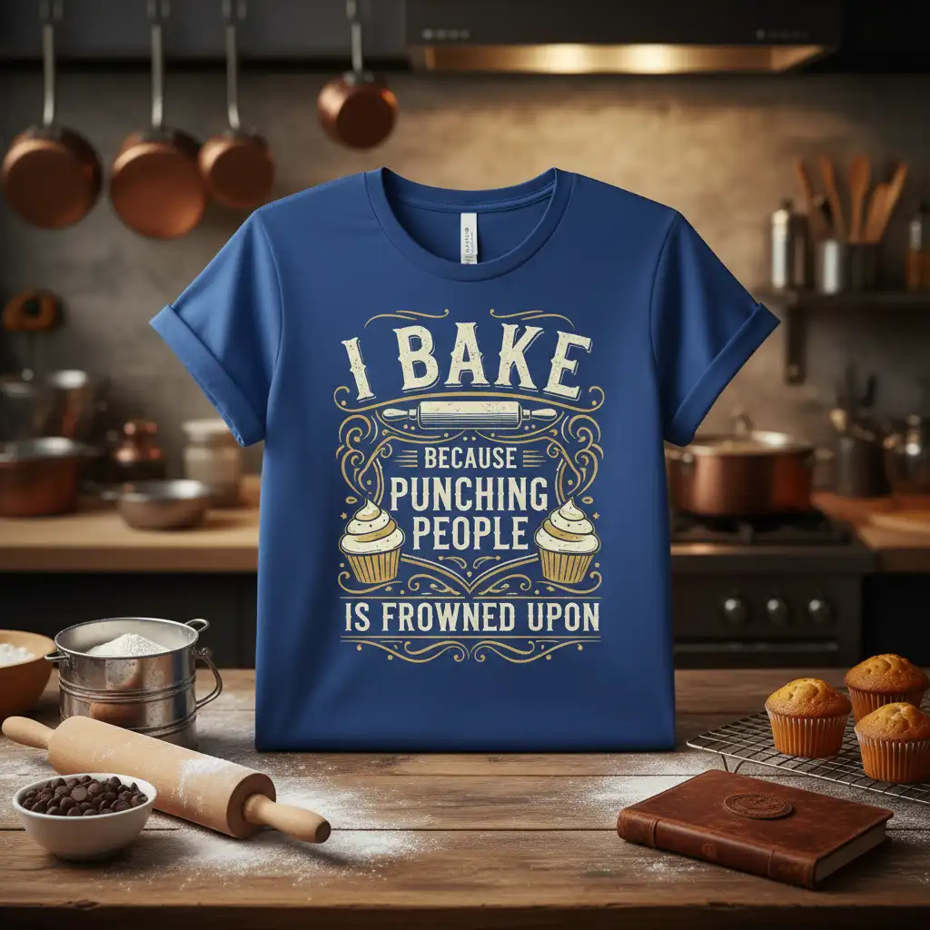Don’t miss out on the chance to own this hilarious and stylish “I Bake Because Punching People Is Frowned Upon” t-shirt. It’s the perfect way to showcase your baking enthusiasm and sense of humor. Whether for yourself or as a gift for a fellow baking aficionado, this tee is sure to be a hit. Click ‘Add to Cart’ now and let your baking pride shine through with this must-have piece of apparel!