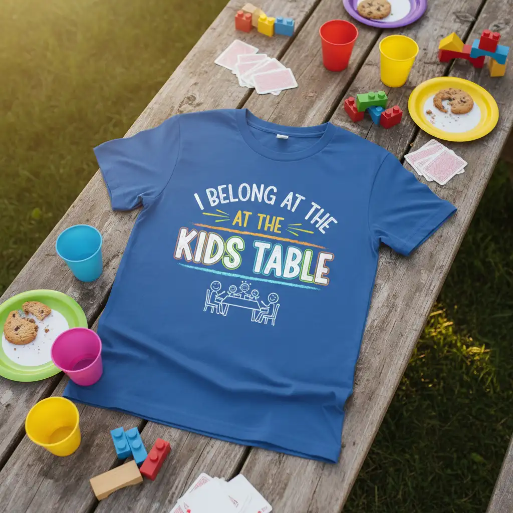 The “I BELONG AT THE KIDS TABLE” t-shirt is more than just clothing; it’s an expression of joy and belonging. It’s perfect for anyone who appreciates the fun, slightly chaotic, and always memorable moments spent with family and friends. This design resonates with a universal feeling of embracing the lively spirit that often surrounds the youngest members of any gathering, making it a cherished item for many.