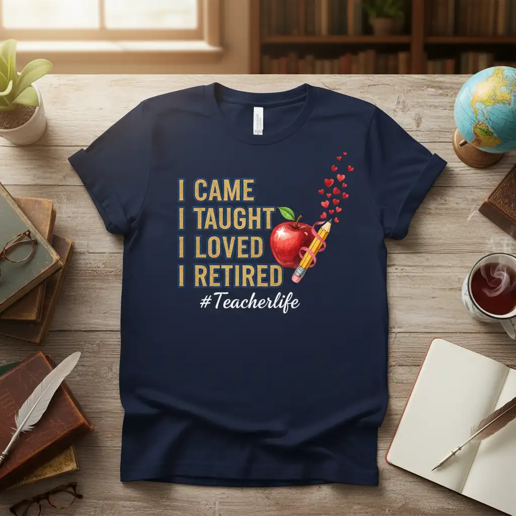 This special t-shirt proudly displays the phases of an educator’s career: “I Came, I Taught, I Loved, I Retired.” It’s a powerful reminder of the dedication and passion that teachers bring to their students every single day. The design symbolizes the full arc of a teaching career, acknowledging the hard work and the profound impact made. This makes it an ideal garment for retired teachers to wear with pride, reflecting on their years of service and the lives they’ve touched.