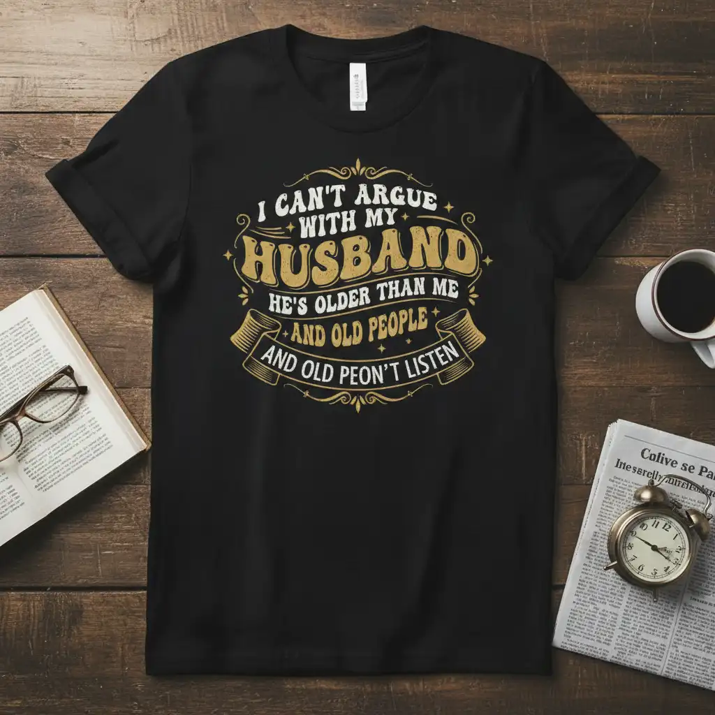 This unique t-shirt celebrates the funny side of marriage with its bold declaration. The phrase “I Can’t Argue With My Husband” is prominently displayed, followed by the humorous reasoning: “He’s Older Than Me And Old People And Old Peon’t Listen.” This witty combination is sure to resonate with wives who understand the subtle art of picking their battles, or perhaps just enjoying the humor in their husband’s perceived wisdom. The design is rendered in a classic, eye-catching style that makes the message clear and amusing.