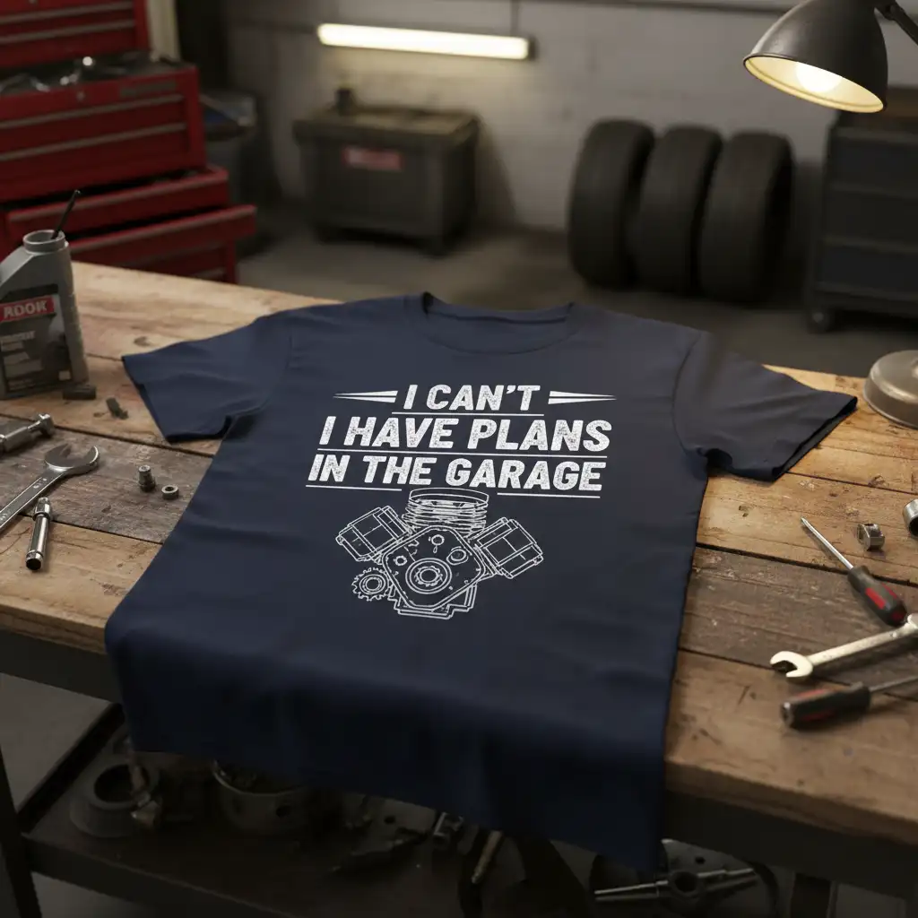 I CAN’T HAVE PLANS IN THE GARAGE is more than just a slogan; it’s a declaration of devotion for those who find their sanctuary amongst tools and engines. This T-shirt is designed for the true car enthusiast, the dedicated mechanic, and anyone who understands the magnetic pull of the workshop. It speaks to a lifestyle where the garage isn’t just a place to park a car, but a space for passion, creativity, and endless projects. Wearing this tee is a badge of honor, signifying a commitment to the automotive world that transcends everyday schedules and commitments.