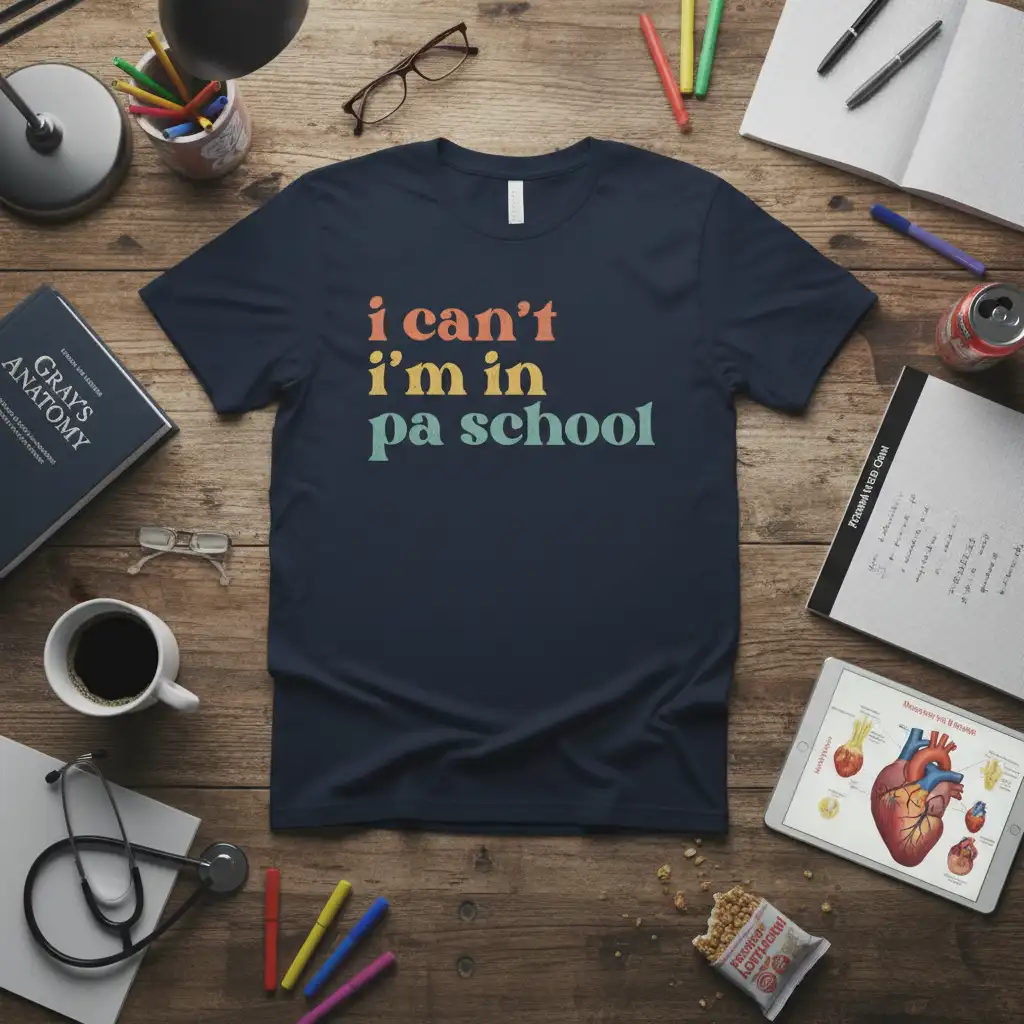 This unique t-shirt proudly displays the relatable phrase “i can’t i’m in pa school” in a stylish, retro-inspired font. The vibrant, alternating colors add a touch of personality, making it a standout piece for any aspiring PA. It’s designed to be a conversation starter, connecting you with fellow students and healthcare professionals who appreciate the demanding nature of medical education.