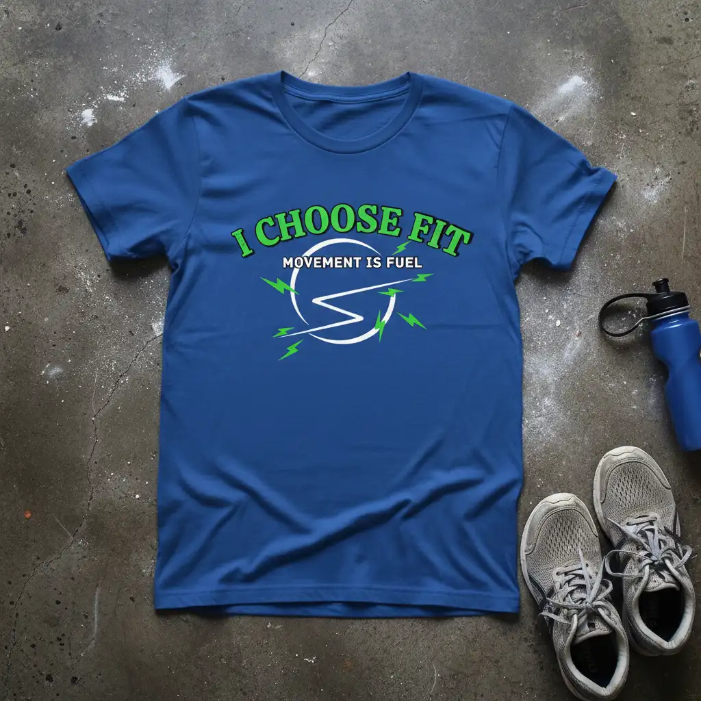 This vibrant t-shirt proudly displays the powerful mantra “I CHOOSE FIT MOVEMENT IS FUEL” in eye-catching green and white lettering. The design incorporates energetic lightning bolt graphics, symbolizing the power and dynamism that movement brings to life. It’s crafted for individuals who see exercise not as a chore, but as essential fuel for their body and mind. This shirt is an ideal way to express your dedication to an active lifestyle and inspire those around you.