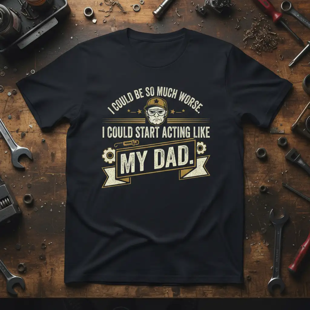 I Could Be So Much Worse. I Could Start Acting Like My Dad. This t-shirt is a humorous declaration that resonates with anyone who appreciates the unique quirks and wisdom of their father. It’s designed for those who understand that sometimes, the best way to avoid worse scenarios is to simply embrace the legacy of dad. The bold typography and graphic elements combine to create a statement piece that’s both funny and relatable, perfect for gifting or personal wear.