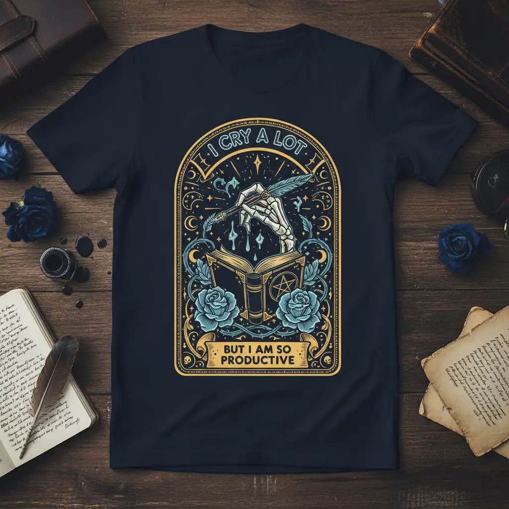 I Cry A Lot But I Am So Productive is more than just a phrase; it’s a declaration of creative resilience and artistic dedication. This t-shirt captures that sentiment perfectly, blending a touch of the gothic with an undeniable acknowledgment of hard work and output. It’s designed for the writers, the artists, the dreamers, and anyone who understands that tears can often fuel incredible achievements. The intricate design speaks to a deep well of inspiration, reminding us that emotional expression can be a powerful catalyst for creation. Wear it proudly as a badge of honor for your creative journey.