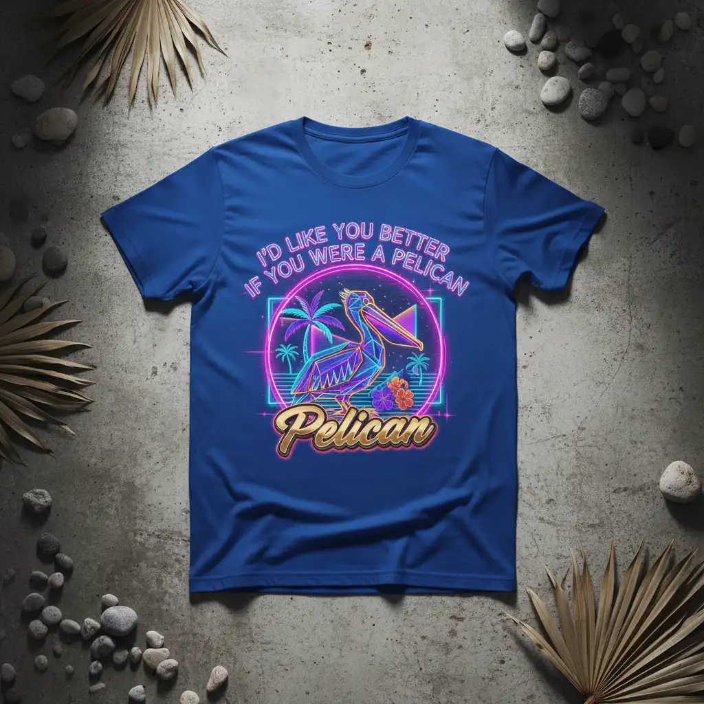 I’d Like You Better If You Were A Pelican, this t-shirt is designed to make a statement and bring a smile to anyone’s face. It perfectly blends a humorous sentiment with a visually striking retro design, making it a standout piece for any casual wardrobe. The unique graphic features a stylized pelican, tropical elements, and vibrant neon colors that evoke a sense of nostalgia and fun. This shirt is more than just apparel; it’s a conversation starter and a declaration of your distinctive personality. It’s ideal for those who appreciate witty wordplay and bold, artistic graphics.