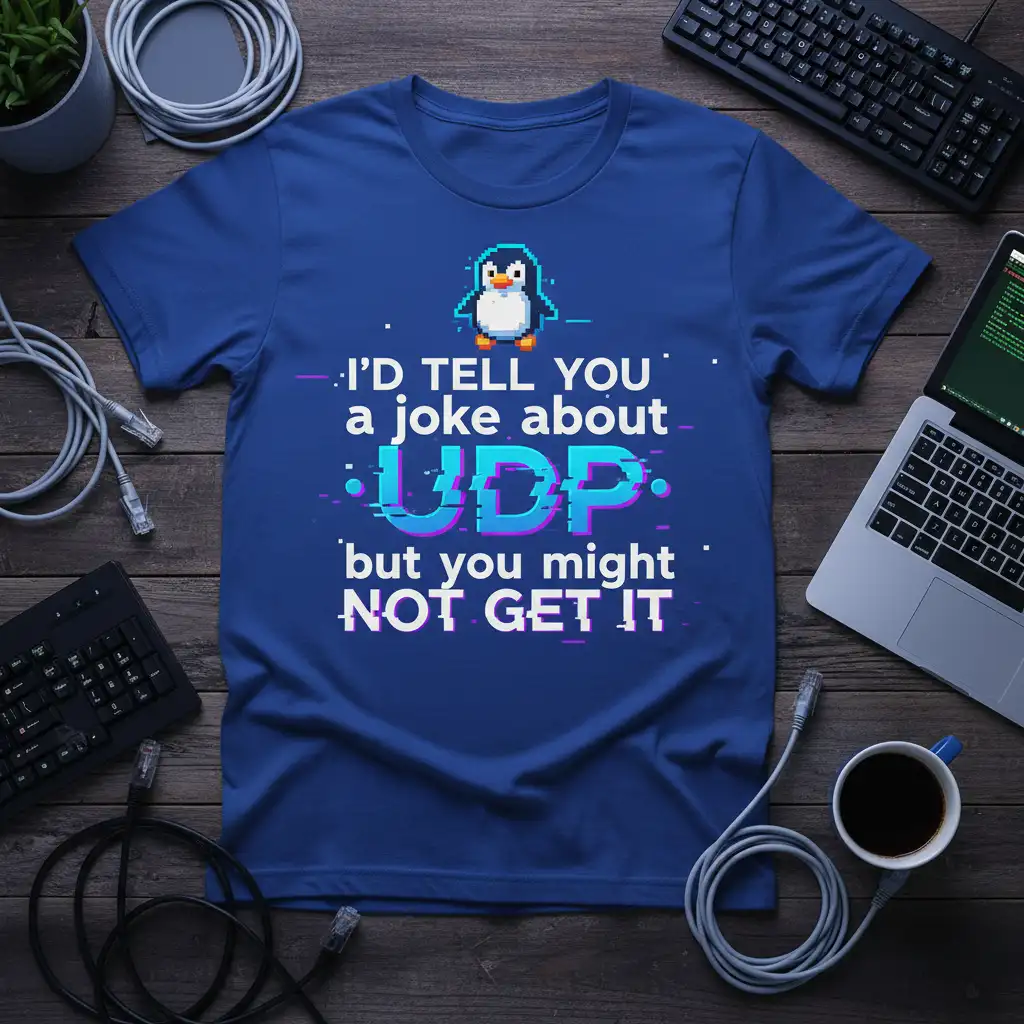 I’d Tell You a Joke About UDP But You Might Not Get It is more than just a t-shirt; it’s a statement for anyone deeply entrenched in the world of technology and networking. This tee captures a classic IT inside joke, making it instantly relatable for programmers, system administrators, and anyone who understands the nuances of data transmission protocols. The design is eye-catching, featuring a charming pixelated penguin and bold, glitchy text that perfectly encapsulates the humor and spirit of the tech community. It’s the ultimate conversation starter for those who appreciate wit and a good laugh.