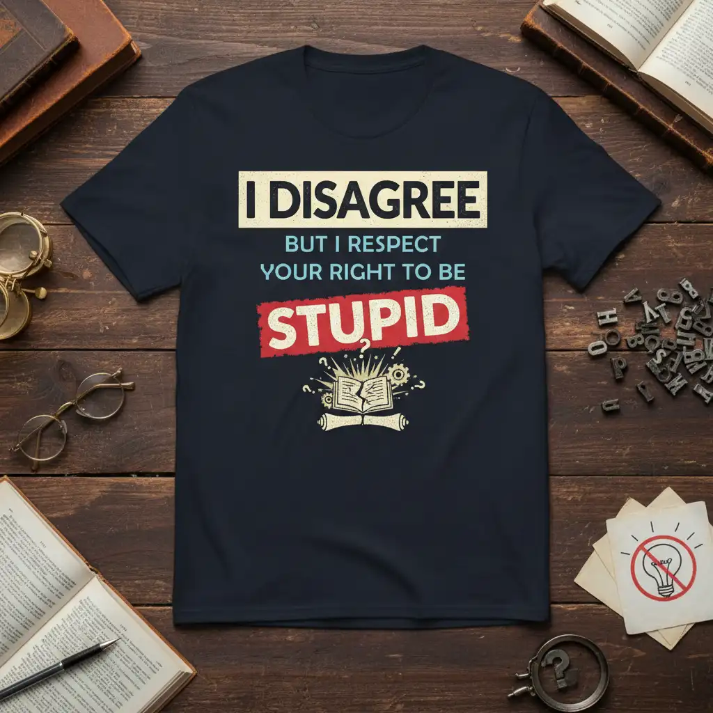 This tee is a perfect embodiment of sarcastic humor, designed for individuals who can deliver a sharp retort with a smile. The phrase “I DISAGREE BUT I RESPECT YOUR RIGHT TO BE STUPID” captures a common sentiment expressed in witty circles. It’s ideal for sparking laughter and acknowledging the often-humorous dynamics of differing opinions. This shirt is a must-have for anyone who believes that intelligence and a good sense of humor go hand-in-hand, offering a playful way to express your sharp intellect.