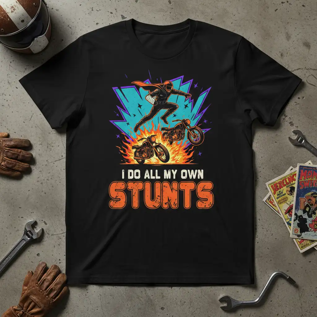 Pick from Black, Navy, Royal, Dark Heather, Red, and White to match your mood and wardrobe staples. Each colorway keeps the I DO ALL MY OWN STUNTS design clear and photo-ready for everyday wear.