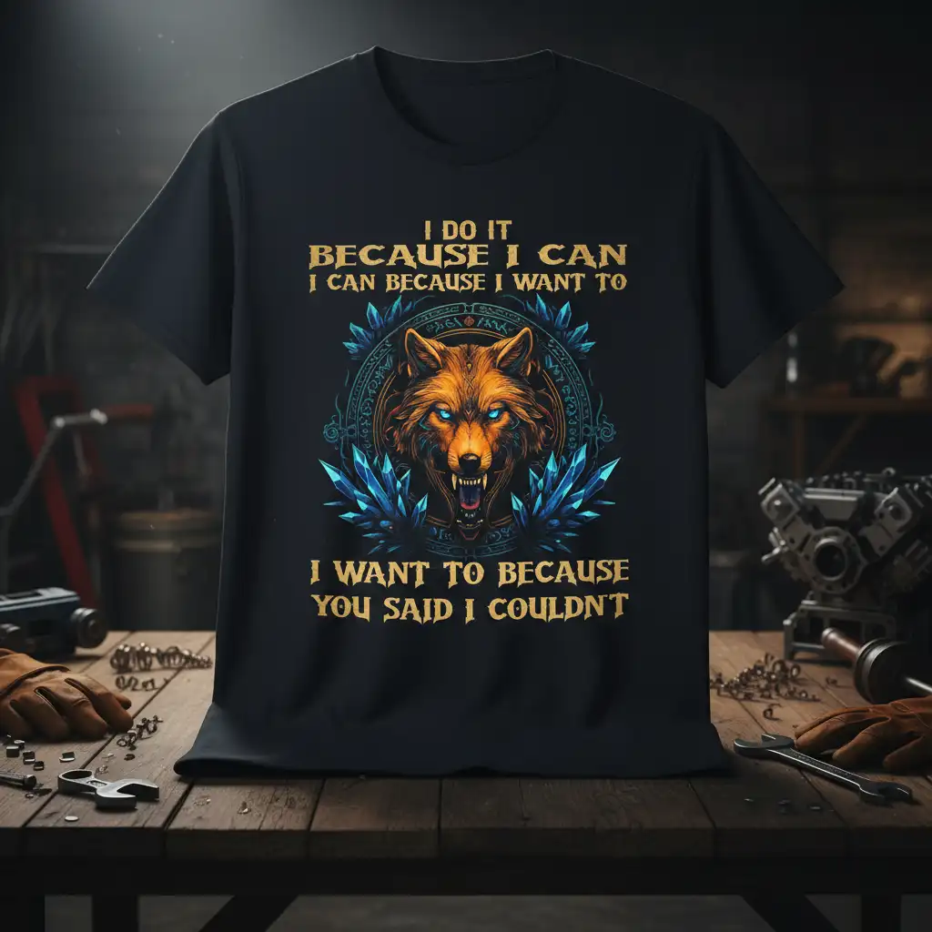 This t-shirt is a testament to the power of self-belief and the relentless pursuit of one’s goals. The bold typography of the quote, “I DO IT BECAUSE I CAN I CAN BECAUSE I WANT TO I WANT TO BECAUSE YOU SAID I COULDN’T,” is designed to capture attention and inspire action. It speaks to the individual who is driven by passion and purpose, unswayed by external negativity or doubt. The accompanying wolf graphic, with its piercing gaze and powerful stance, perfectly complements the message of resilience and fierce independence.