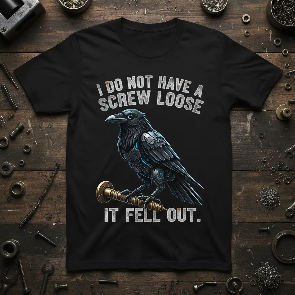 I Do Not Have A Screw Loose It Fell Out. This unique t-shirt is designed to bring a smile to anyone’s face, especially those who appreciate a good pun and have a knack for mechanics or technology. The design features a striking robotic raven perched confidently on a large screw, embodying a clever twist on a common phrase. It’s perfect for expressing your personality and love for all things mechanical with a touch of humor. This apparel is more than just clothing; it’s a statement piece that sparks conversations and showcases your sharp wit.