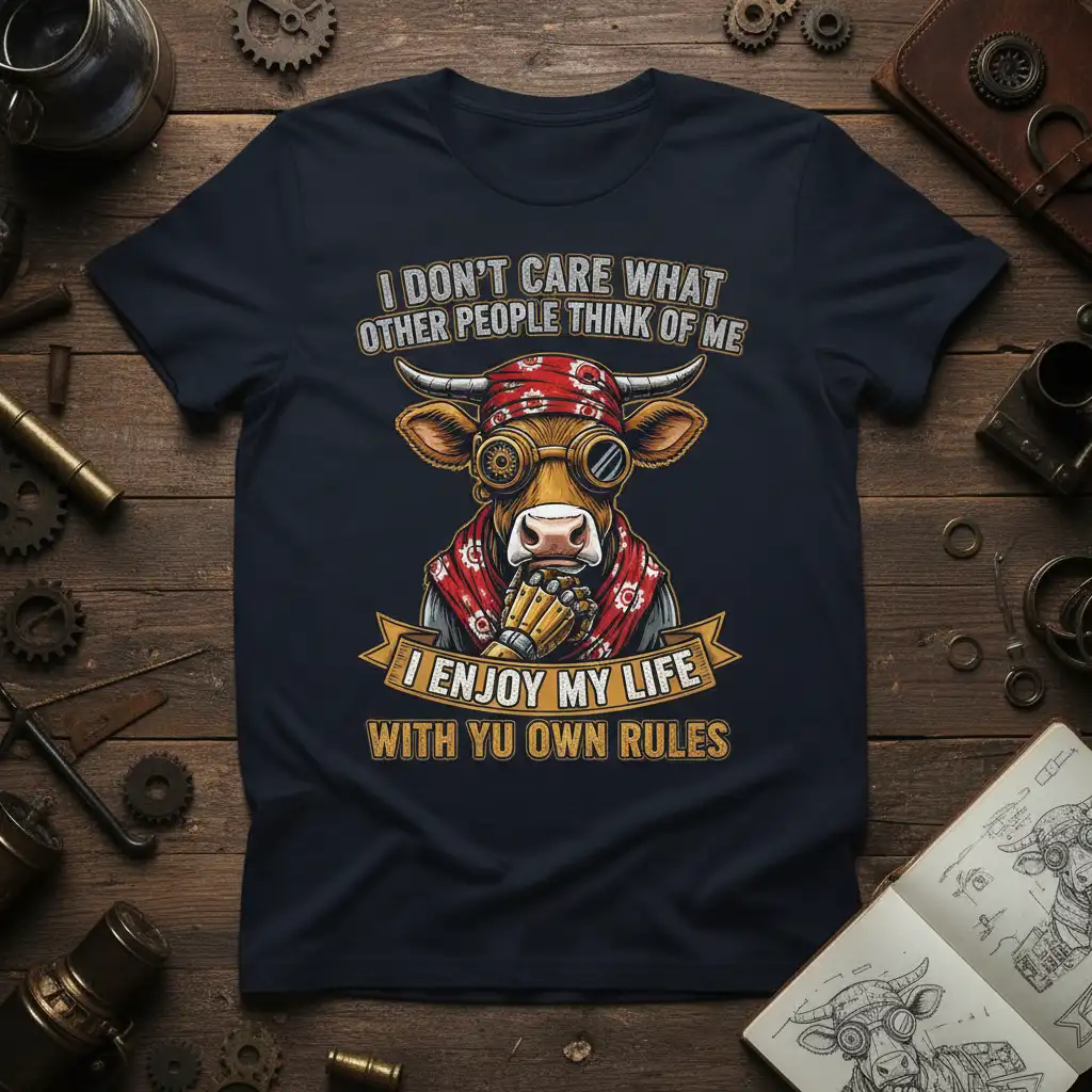 I DON’T CARE WHAT OTHER PEOPLE THINK OF ME I ENJOY MY LIFE WITH YU OWN RULES is more than just a phrase; it’s a philosophy embodied in this striking t-shirt design. This garment is crafted for the bold, the independent, and those who march to the beat of their own drum. It’s for the free spirits who understand that true happiness comes from living authentically, unfettered by the judgments of others. The unique steampunk cow graphic adds a touch of edgy flair, making this tee a conversation starter and a powerful statement piece.