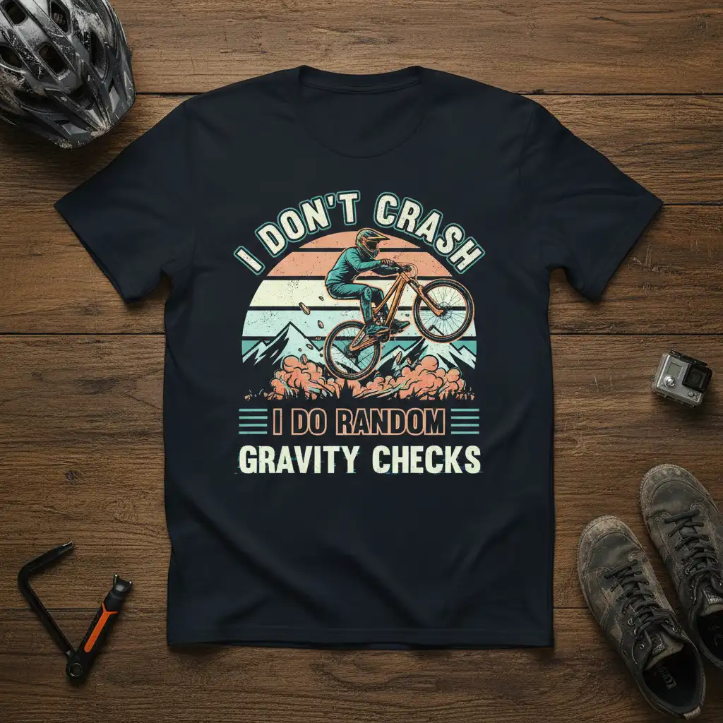 Searching for a unique gift for a mountain biker, cyclist, or adventure enthusiast? Look no further than the “I DON’T CRASH I DO RANDOM GRAVITY CHECKS” t-shirt. It’s a thoughtful and humorous present for birthdays, holidays, or just because. This tee is sure to bring a smile to their face and become a favorite in their collection, reminding them of their passion for the great outdoors and their adventurous spirit.