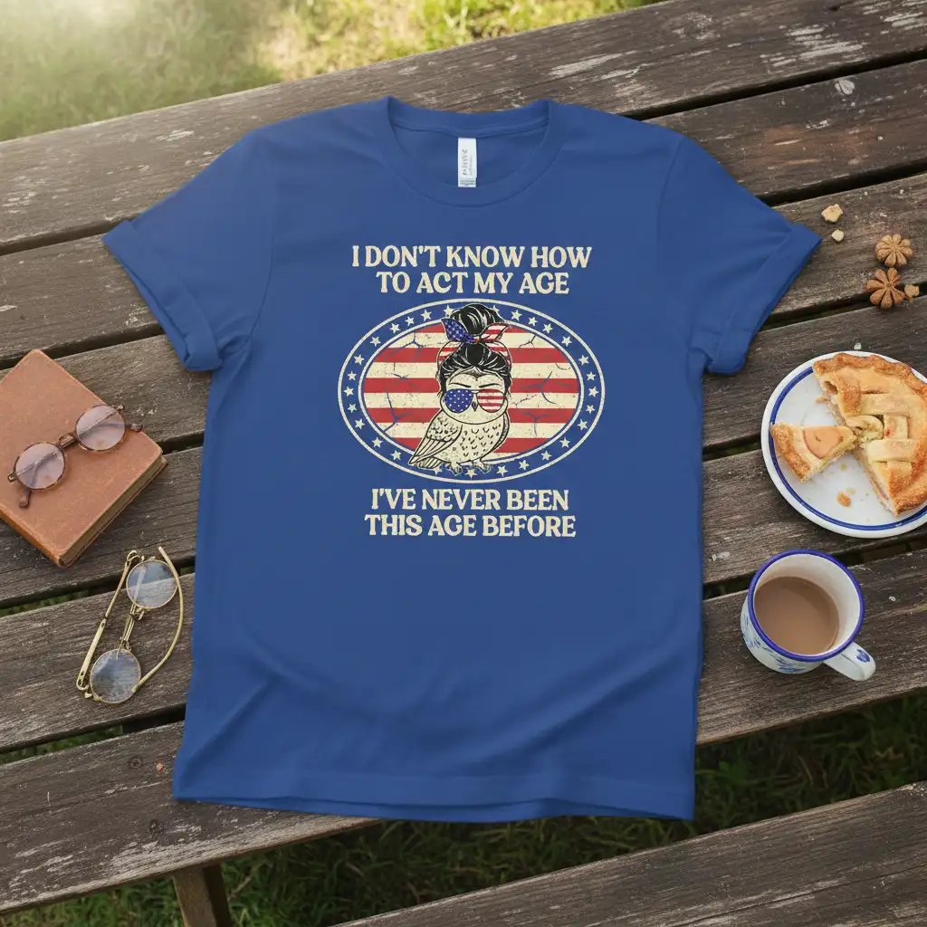 This hilarious and relatable quote, “I DON’T KNOW HOW TO ACT MY AGE I’VE NEVER BEEN THIS AGE BEFORE,” perfectly encapsulates the feeling of maintaining a young heart and adventurous soul. It’s a sentiment shared by many who refuse to let age define their actions or their zest for life. The design features a charming retro owl, complete with sunglasses and a messy bun, set against a backdrop of patriotic stars and stripes, adding a touch of vintage flair.